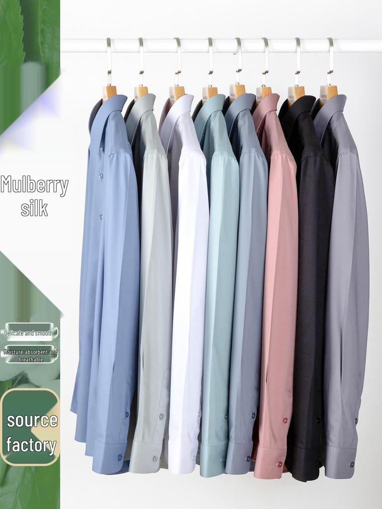 Experience the luxury of our Men's High-End Mulberry Silk Long-Sleeve Casual Shirt, designed for the discerning gentleman. Crafted from premium artificial silk material, this exquisite shirt features a modern square neckline and solid pattern, ensuring a sleek, timeless look. The long sleeves offer style versatility, while the material's natural drape and non-iron properties make it perfect for effortless autumn elegance.