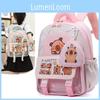 This children's school bag features a playful cartoon capybara pattern, made from durable oxford cloth and lined with polyester for added strength. Measuring approximately 34*25*12cm, it supports lightweight carrying with ergonomic curved shoulder straps. Ideal for kindergarten students, it helps reduce load during school days. Wipe clean with a damp cloth for maintenance.