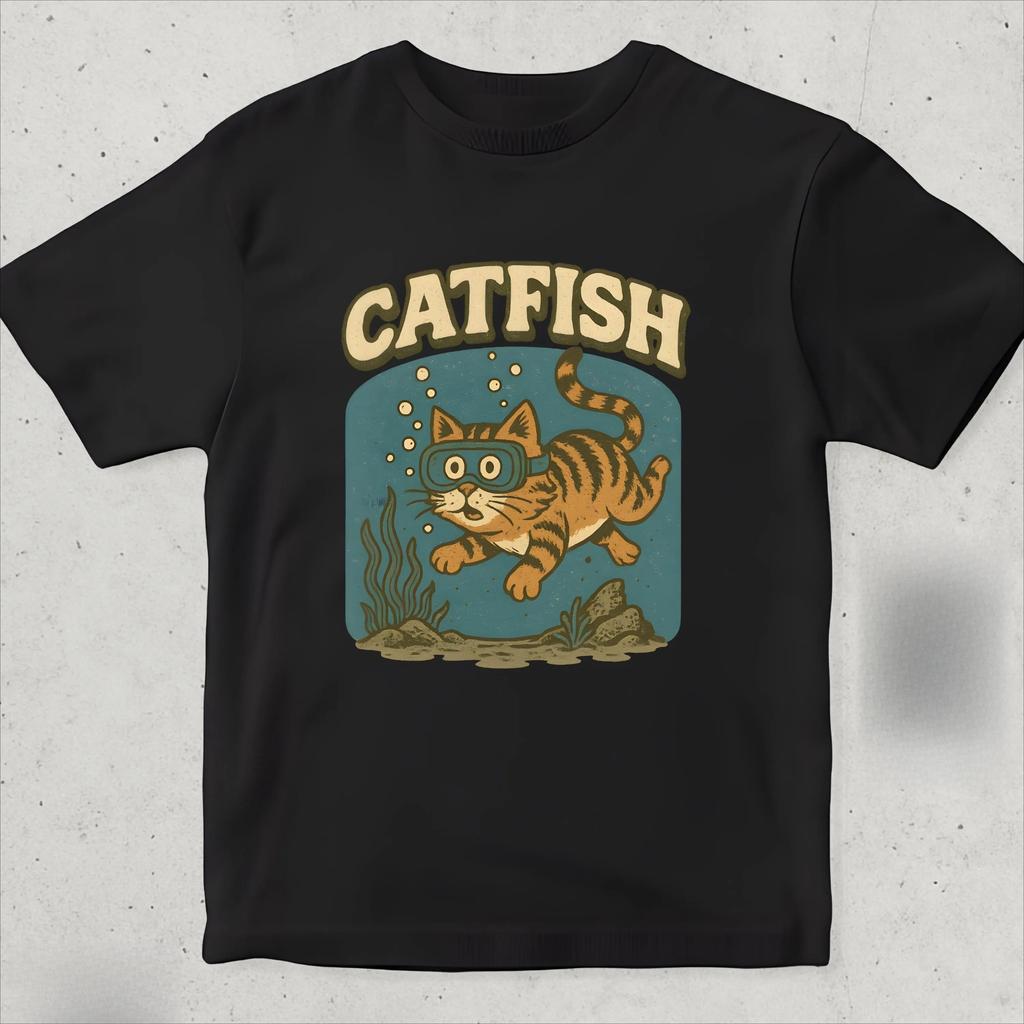Funny Catfish T-Shirt with Scuba Diving Cat Graphic / Cute Retro Animal Pun Tee for Cat Lovers Humorous Vintage Style Cat Shirt