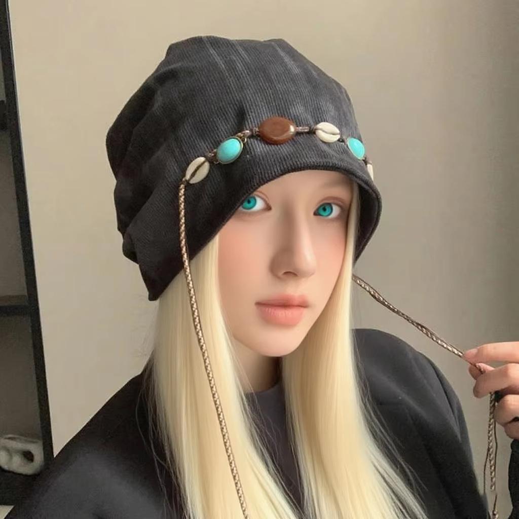 Hot Sale Women Fashionable Gem Chain Decorated Solid Color Versatile Outdoor Photography Autumn Winter Warm Retro Stacked Hat