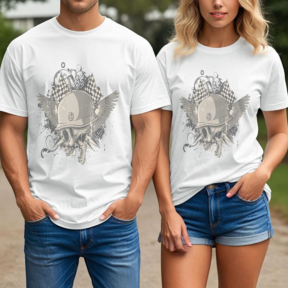 Winged Skull Biker Helmet T-Shirt |Punk Rock Metal Spikes Racing Flag Tee Unisex