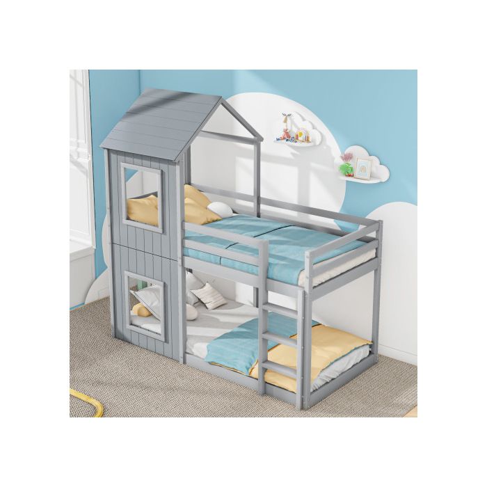 Lit superposé - MUVOE - 90x200 cm - Bois massif - Gris - Avec échelle et baldaquin