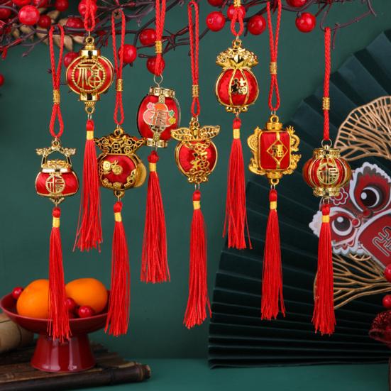 This lantern ornament brings festive charm and traditional symbolism to any setting. Perfect for hanging on doors, windows, cars, or gift boxes, it instantly enhances the New Year atmosphere with its vibrant red and gold colors. Crafted from durable materials with a metal three-dimensional design, it features intricate details like coins, lucky bags, and the auspicious "fu" character, symbolizing wealth and good fortune.
