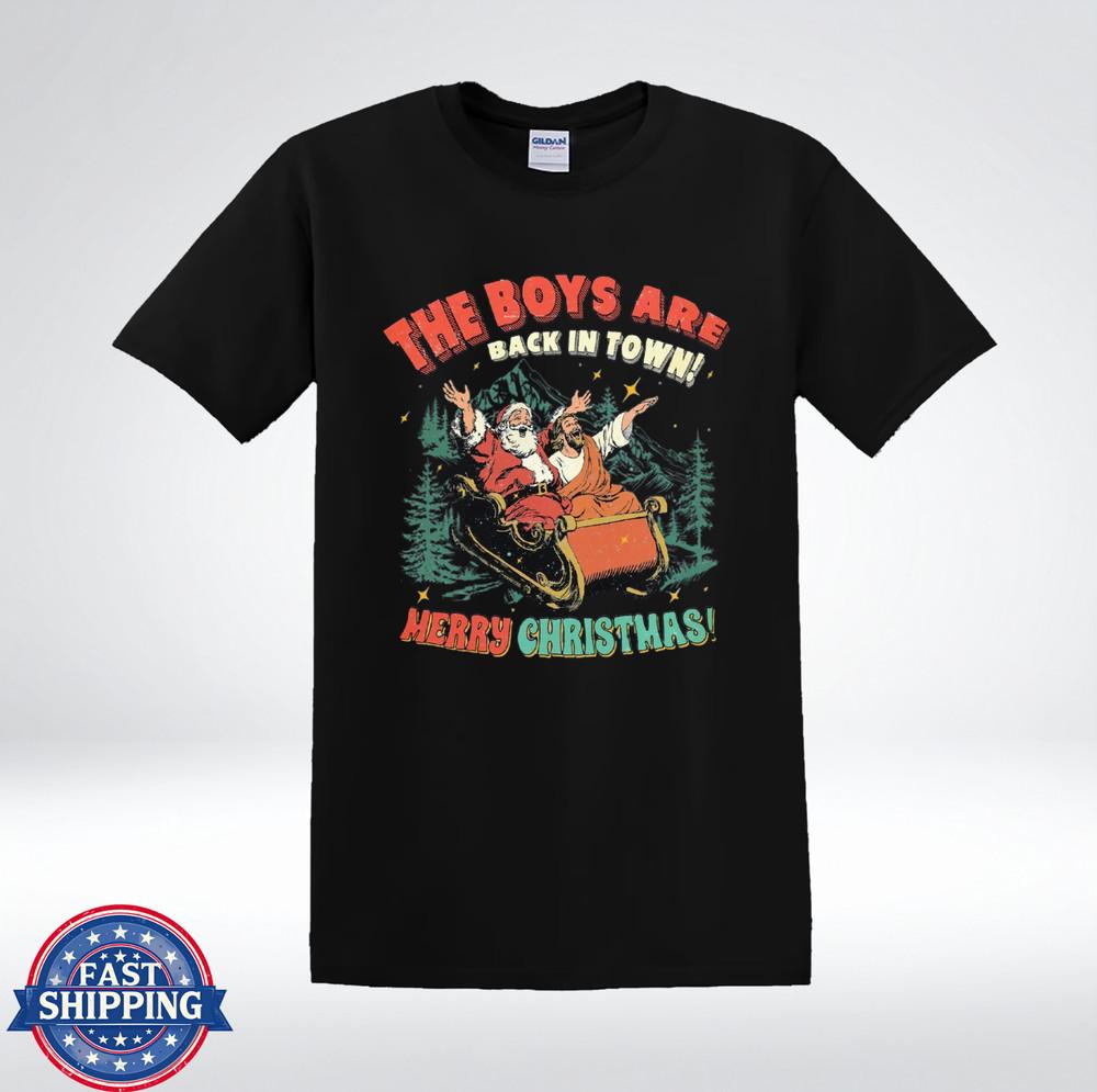Retro Holiday Icons Sleigh Scene The Boys Are Back Merry Christmas T-Shirt