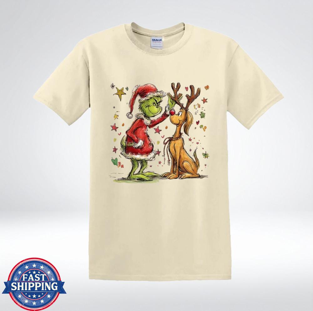 Cute Grumpy Green and Dog Christmas Sketch Art Holiday Funny T-Shirt