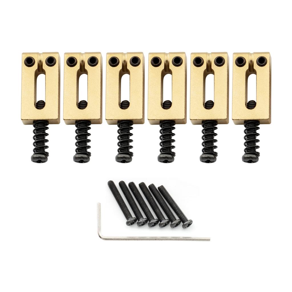The saddles are 10.5mm wide, 20mm long, and have a 10.5mm pitch. Made of precision CNC-machined brass, they are robust, stable, and provide excellent intonation.
