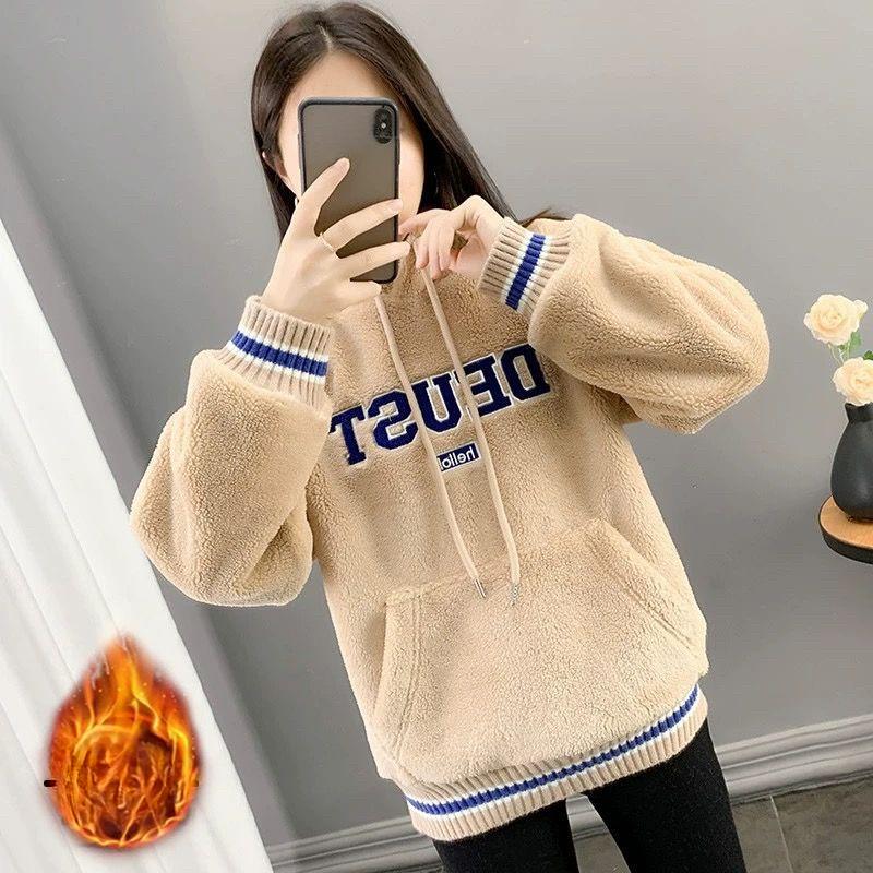 Χειμωνιάτικο Ολοκληρωμένο Βελούδινο Φούτερ με Κουκούλα Κεντημένο με Γράμματα για Γυναίκες Νέο Κορεατικό Στυλ Ζακέτα Με Επένδυση Βελούδου Παχύ Χαλαρό Τοπ