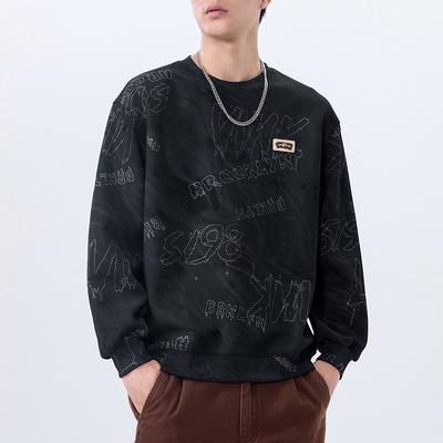 Wassup Rose Circle Letter Trendy Brand Crew Neck Sweatshirt for Men, New Heavyweight Pullover Top for Couples in Spring and Autumn