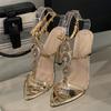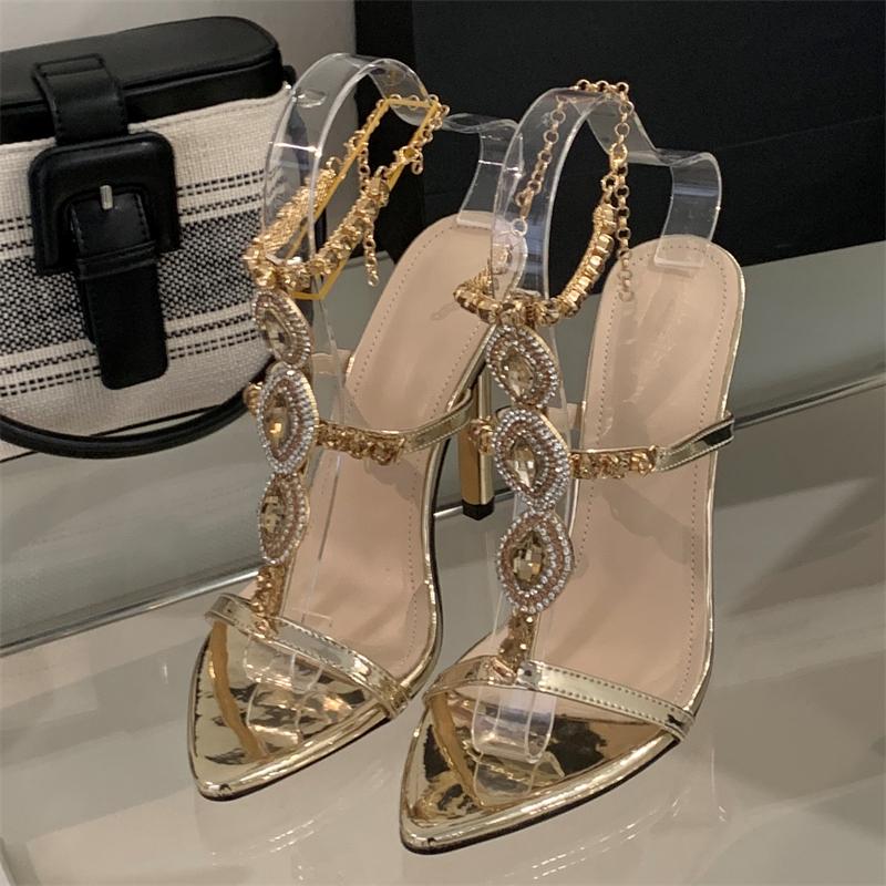 Fashion EilyKen Sexy Golden Pointed Toe Women Women Sandals Design Style Crystal Chain Buckle Strap Thin High Heels Party Prom Shoes