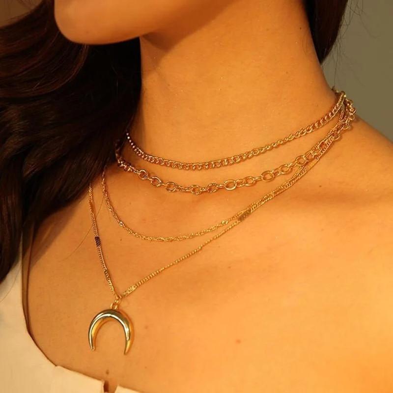 New Bohemian style stacked half moon pendant necklace, multi-layer alloy chain