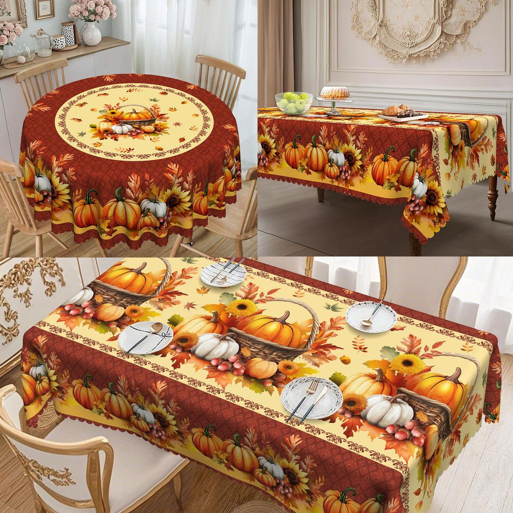 Autumn Harvest Maple Leaf And Pumpkin Tablecloth - Polyester Fabric, Round Thanksgiving Sunflower Design For Dining Tables