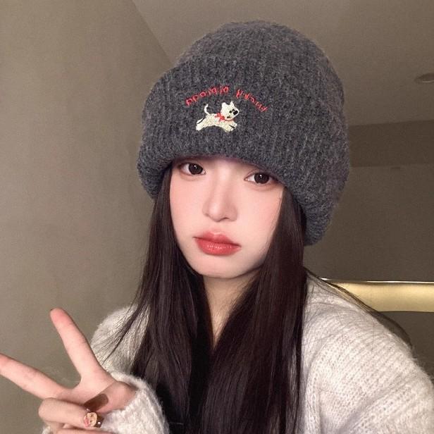 Cute puppy embroidered knitted hat female 2025 season wool hat showing small face big head circumference cold hat white