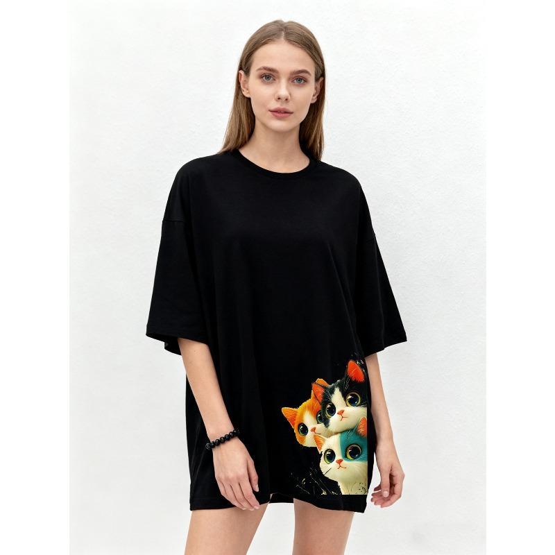 Oversized T Shirt Black Cat Print Graphic Tee Casual Wear for Women Summer Fashion Loose Fit Top Streetwear Style
