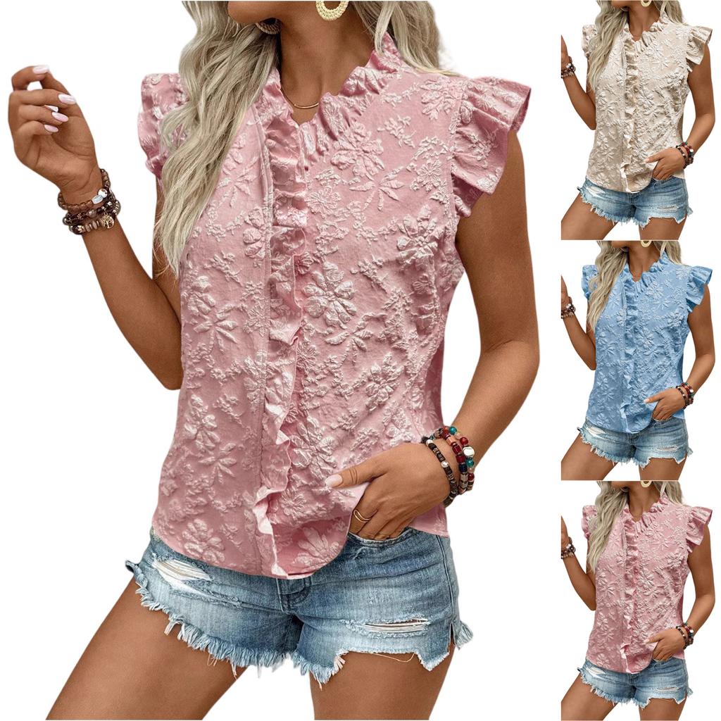 Women's Fashionable Color V-neck Vest With Ruffle Edge Short Sleeved Shirt Top