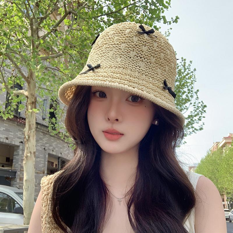Bow Woven Fisherman'S Hat Children Summer Hollow Breathable Straw Hat Sunshade Sunscreen Bucket Hat Showing Face Small Basin Hat
