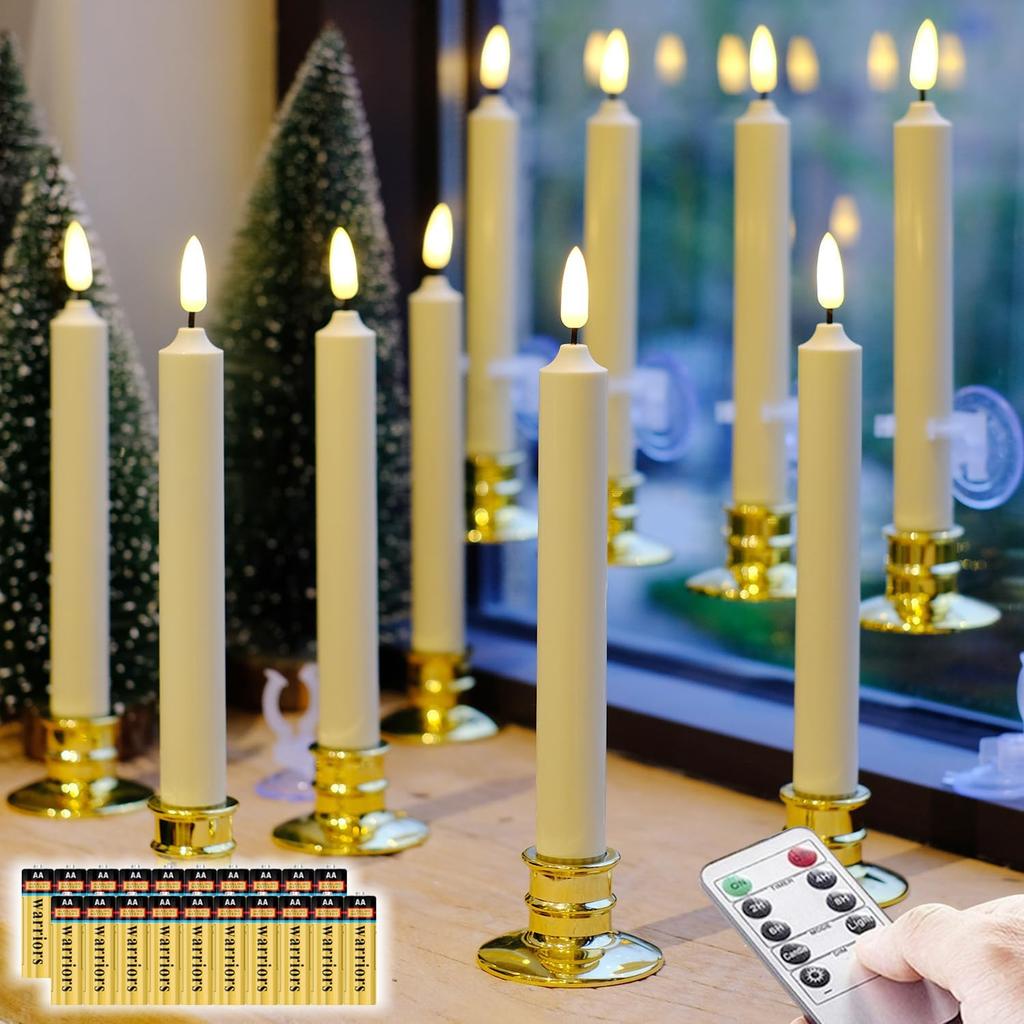 10 Pack Window Candles +20 AA Batteries(Include,Run More Than 400 Hours) + Candleholders + Suction Cups+ 2 Remote. 8'' Tall. IVORY LED Battery