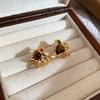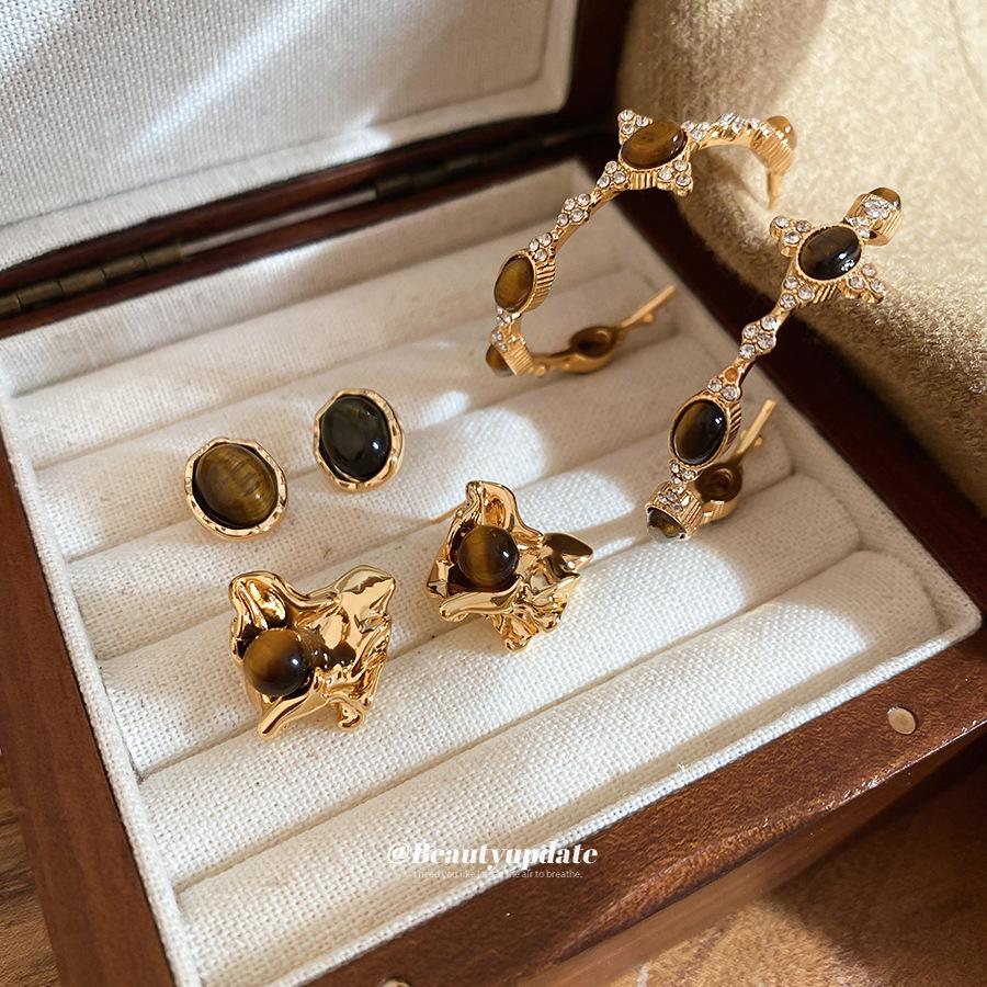 Silver needle tiger's eye stone pleated geometric stud earrings Maillard retro light luxury temperament earrings personalized versatile earrings