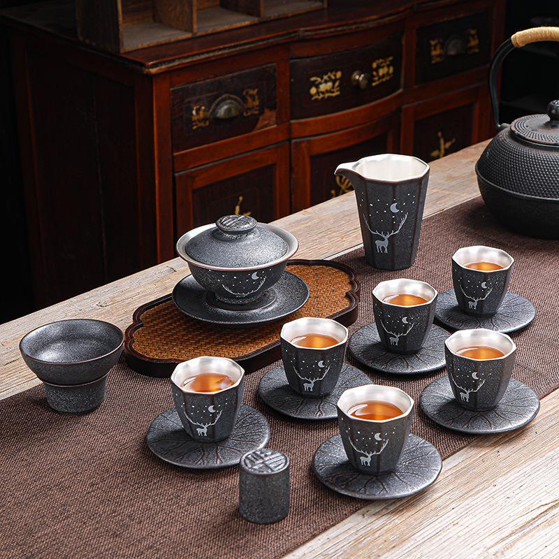 999Pure Silver Tea Set Ceramic Kung Fu Tea Set Tasting Cup Handmade Silver-Plated Tea Bowl Live Streaming Gift