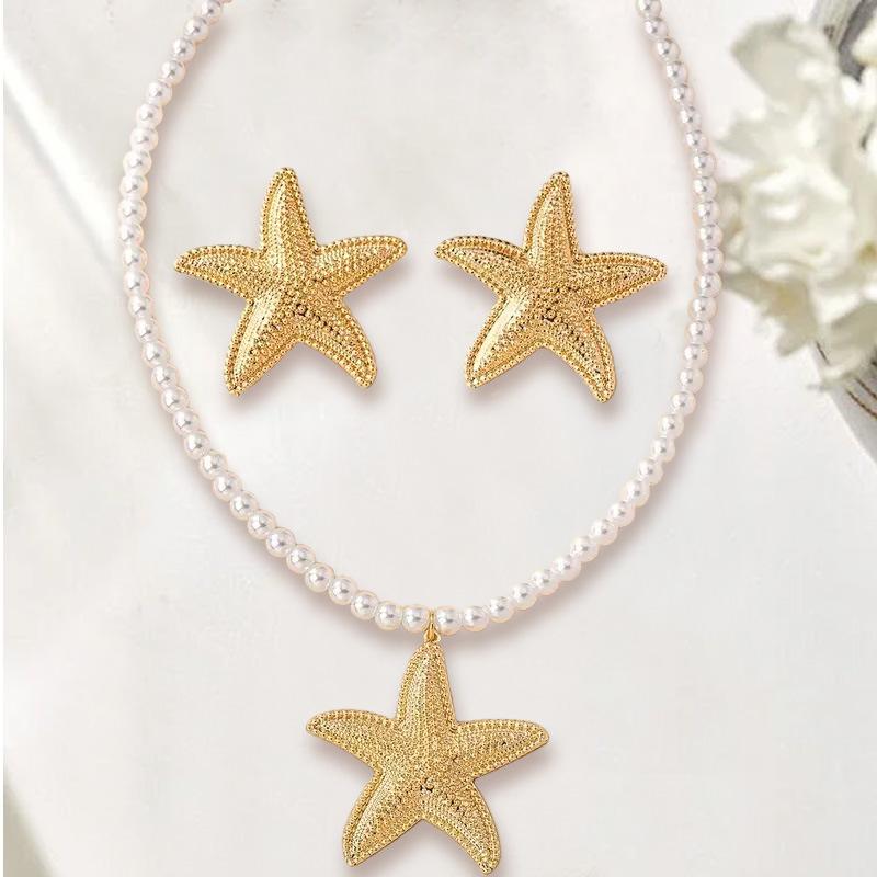 A new set of beach style imitation pearl starfish necklace and a pair of high-end starfish stud earrings.