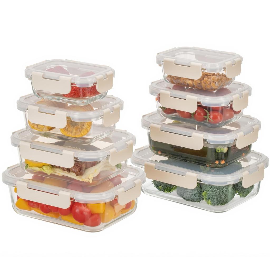 Heat-Resistant Glass Container Set Specifications: ・Set of 8: 2 x 180ml, 2 x 370ml, 2 x 640ml, 2 x 1050ml. ・Reinforced, quadruple-walled closure for a 100% airtight seal, preventing leaks and odors and color transfer. ・The heat-resistant glass container set is stackable for space-saving storage. ・Safe for microwaves, refrigerators, ovens, etc. ・Perfect for storing food, preparing food, making lunch boxes, and keeping fruit fresh. ・BPA-free, environmentally friendly, and compliant with Food Sanitation Act standards.