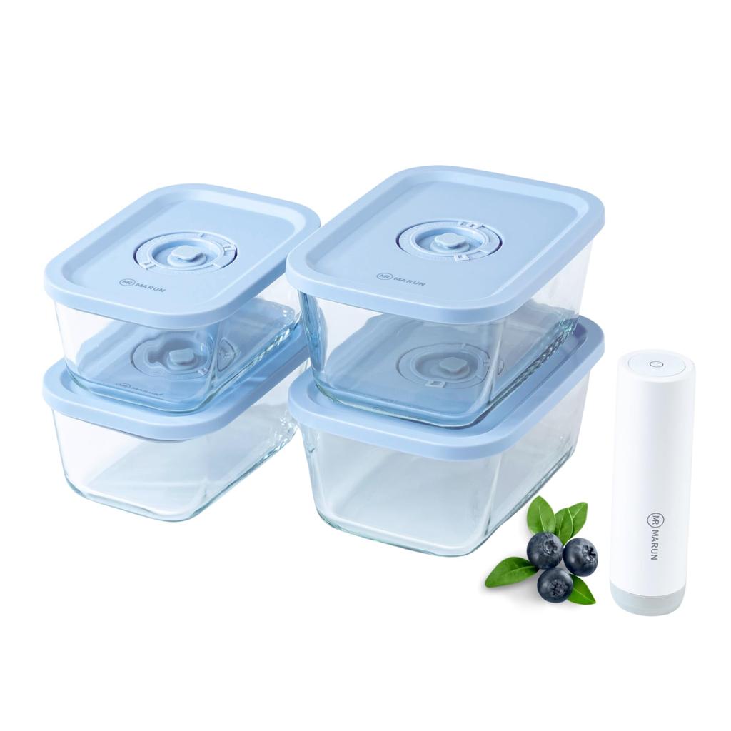 MARUN's Vacuum Storage Container Set D is a practical 5-piece set designed for large-volume storage of main dishes, soups, and stews. It includes two medium-sized containers, two large-sized containers, and a vacuum pump with a fully automatic shut-off function, making it ideal for weekend prep, pre-seasoning, and daily main dish storage. This highly functional heat-resistant storage container set can be used for a wide range of purposes, including refrigeration, freezing, and reheating. The body is made of durable high-borosilicate glass, which is resistant to thermal shock. It can be used in microwaves and ovens, refrigerated and frozen, and dishwasher safe. Glass material is less susceptible to odor and color transfer than plastic, allowing it to be reused cleanly, even with oily and aromatic dishes like curry and soup. Made of BPA-free material, it is safe for the whole family. The vacuum pump operates with a single button. It automatically sucks out the air from the container and shuts off automatically when a vacuum is reached. The effortless, smart design ensures reliable vacuum storage every time. When combined with a lid with a sealing valve, it prevents leakage of juice, moisture, oxidation, and odor transfer, significantly extending the shelf life of food.