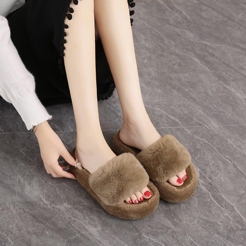 Thick-soled outer wear fluffy slippers women's autumn new one-word home plush slippers open-toed cotton slippers