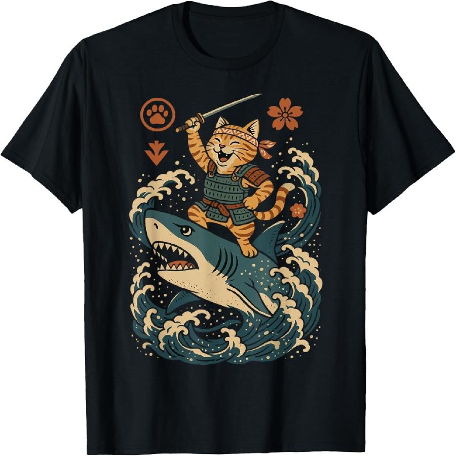 Ukiyo-e Inspired Samurai Cat Surfing Waves Great White Shark T-Shirt for Men Women Kids