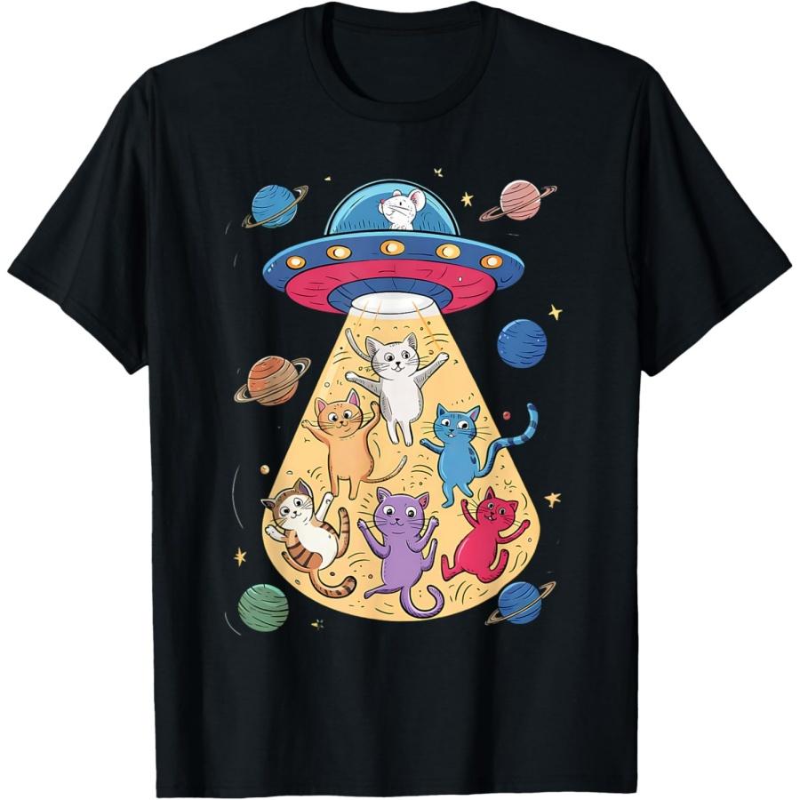 Kids Women's Cosmic Galaxy Cat UFO Abduction by Cute Mouse T-Shirt