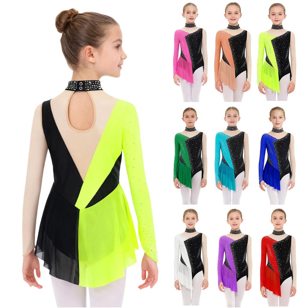 Κορίτσια Λαμπερό Στρας Διχτυωτό Μακρυμάνικο Ολόσωμο Φόρεμα Χρωματική Μπλοκ Κούμπωμα με Κουμπιά στο Κάτω Μέρος Ολόσωμο Ρούχο Χορού Γυμναστικής