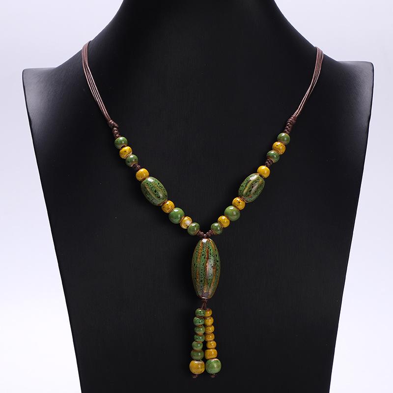 JMXD-ethnic Style Ceramic Necklace, Hand-woven Knotted Beaded Rope Chain, Non-fading Sweater Chain