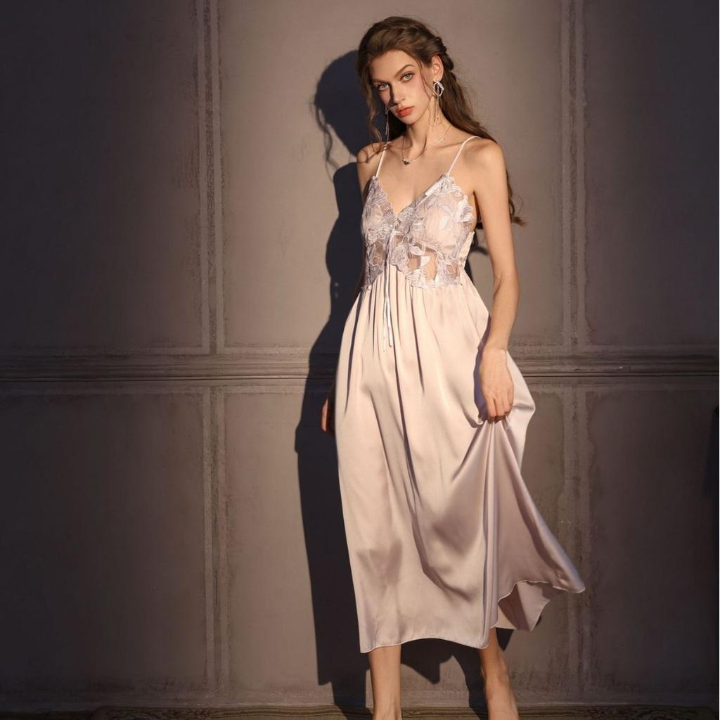Sexy Pajamas Women's Ice Ribbon Chest Pad French Suspender Pajamas Long Over Knee Magnolia Pure Desire Homewear
