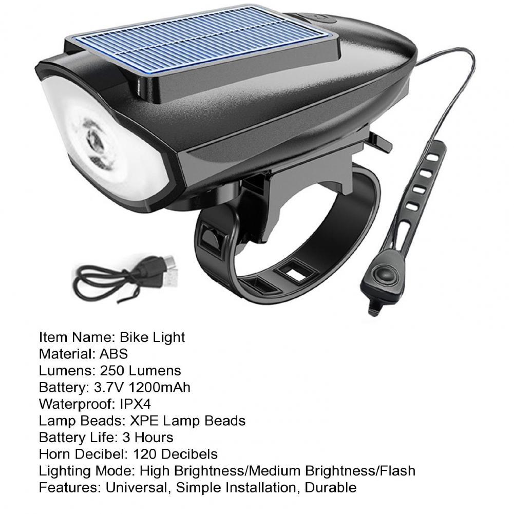 Solar Power Bike Light Waterproof Bicycle Headlight 120 Decibel Horn High Brightness