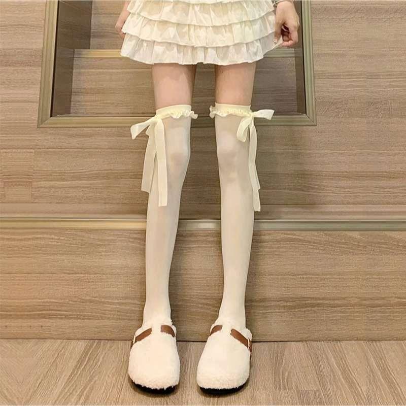 Milk White Lolita Velvet Knee Socks Long Tube Spring And Autumn Lace Ribbon Bow High Tube Socks Lolita