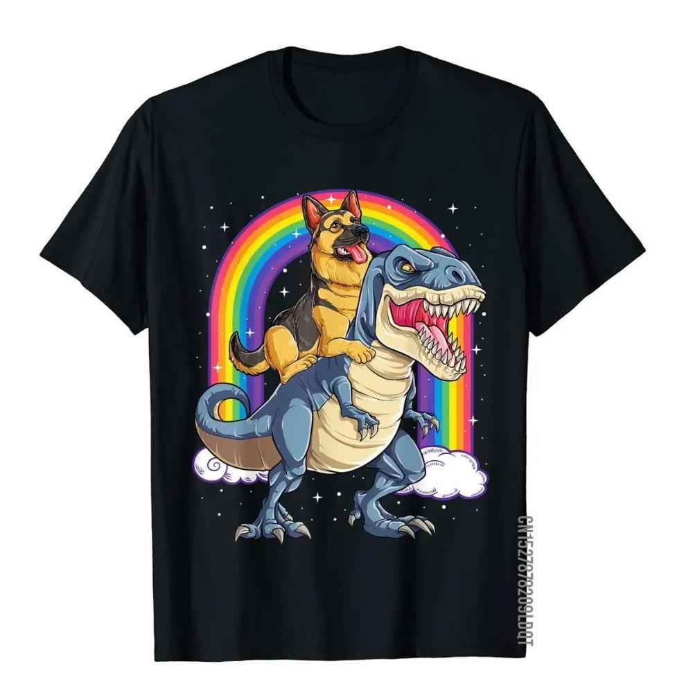 German Shepherd Riding Dinosaur Male Tshirt Rainbow Graphic Printed TShirt Men Summer Casual Crewneck Cotton Short Sleeve