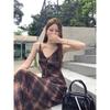 Women's Plaid Spaghetti Strap Maxi V-neck Sheer Mesh Casual Vacation Long Dress