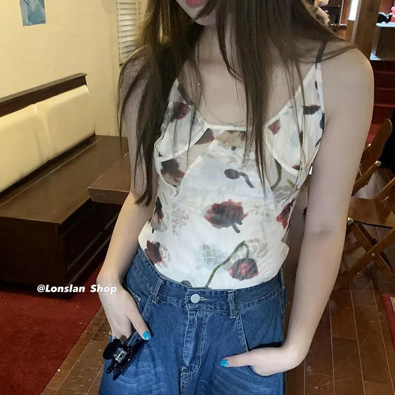 Γυναικείο Μπλουζάκι Camisole με Φλοράλ Σχέδιο Διάφανο Διχτυωτό Αμάνικο Crop Top Y2K Αισθητική