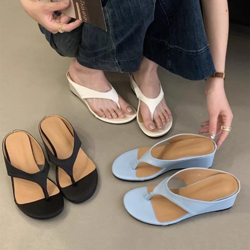 European and American Fashion Versatile Round Toe Wedge Heel Flip Flops for Women Wearing Thick Soled Sandals and Beach Shoes