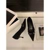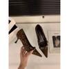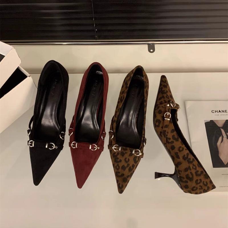 Pointed single shoes, light mouth and thin splicing, leopard print splicing, one pedal metal buckle, sexy temperament, high heels, women's thin heels