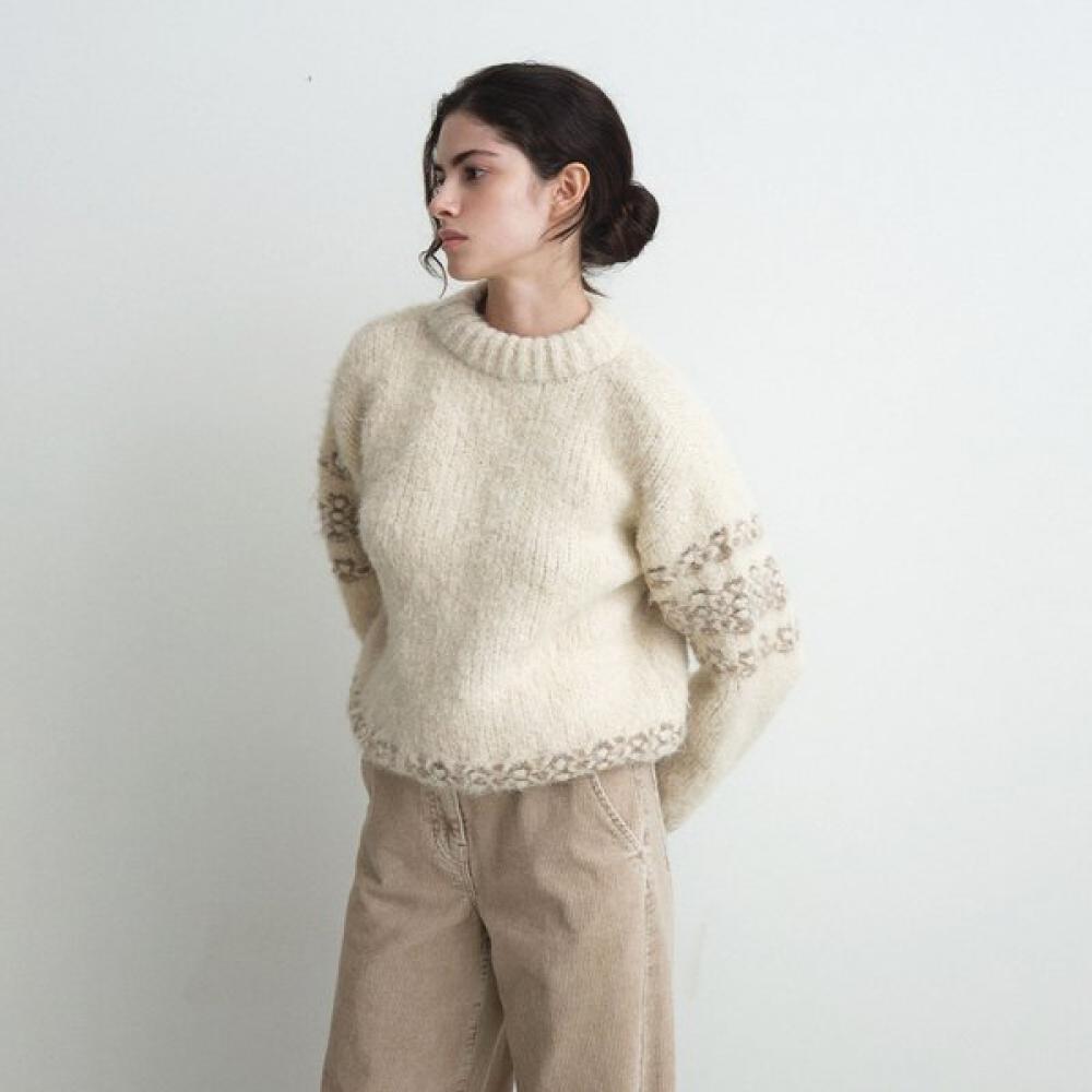 The Joy Gryson Nordic Pattern Knit Pullover KK5WP8070_90 is a casual item that features a distinctive Nordic pattern. Made of soft knit material, it provides a comfortable wear and can be harmoniously matched with various bottoms. The round neck style allows for a relaxed yet sophisticated look.