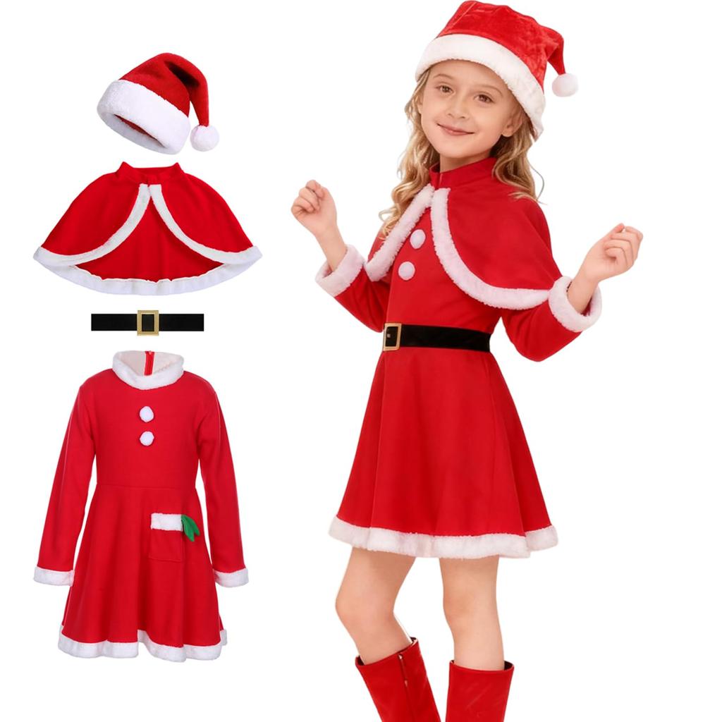 Joyesplay Christmas Cosplay Kids Santa Dress Santa Claus Christmas Outfit for Santa School Stage Commemorative Gift 4-Piece Set, Costume, Girls,