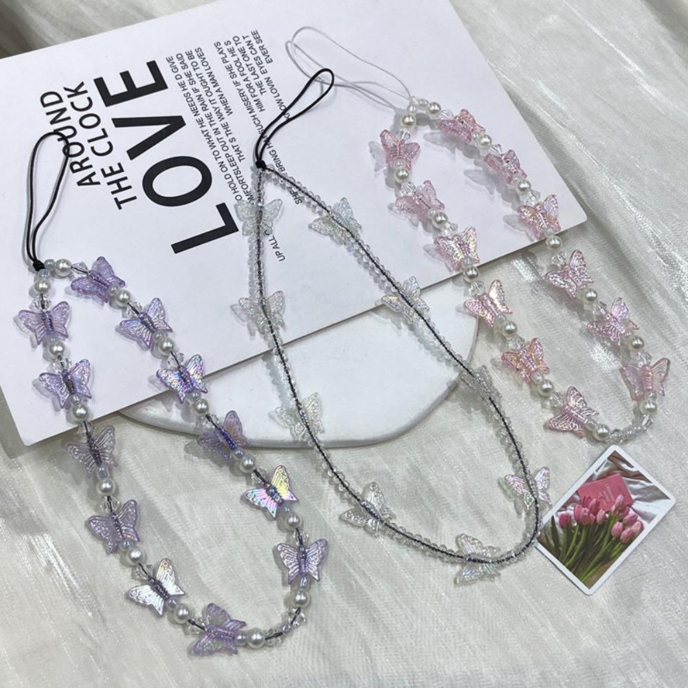 Butterfly Beaded Butterfly Cellphone Lanyard Anti-lost Crystal Clear Candy Colors Cellphone Keychain Sweet Kawaii