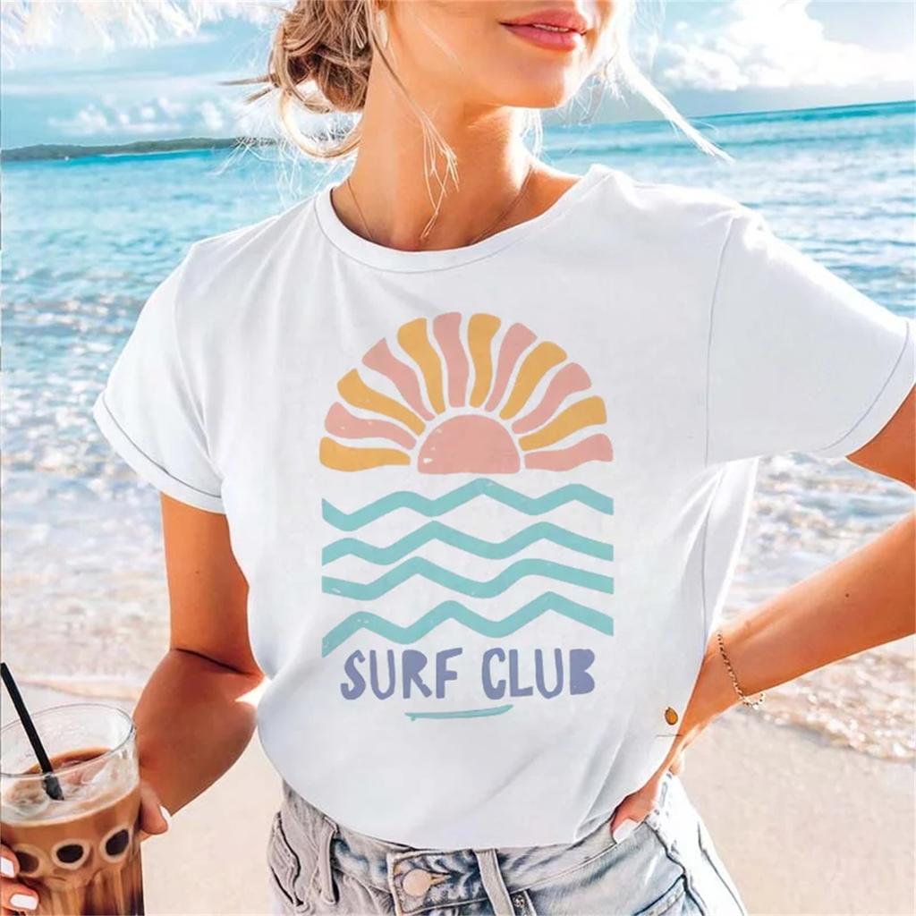 Pattern Surf Club Printed Street Women's Cartoon Summer T-Shirt Clothing Cute O-Neck Top Style Printed Travel Vacation T-Shirt