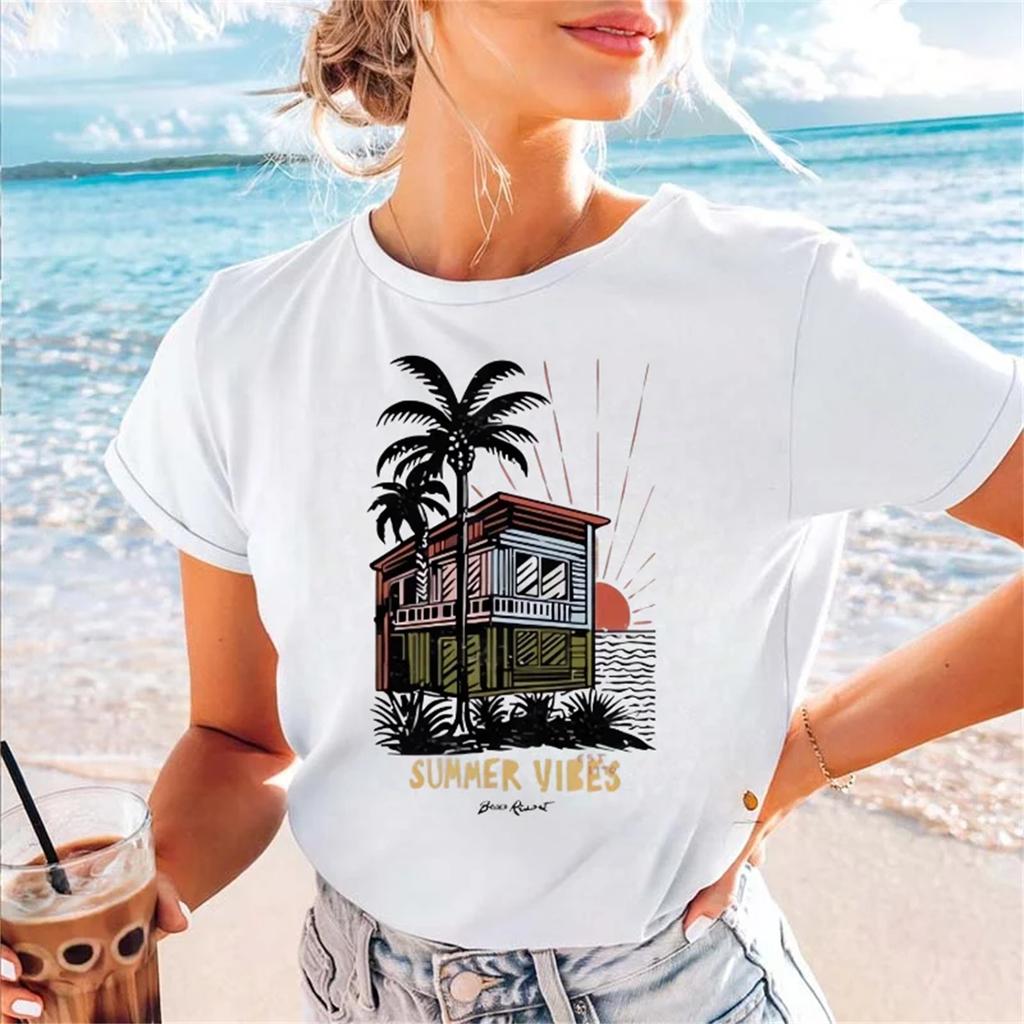 Retro Harajuku Short Sleeved Seaside Vacation Fun Round Neck Popular Women's 90s Trend Casual Cute Regular Top Summer T-Shirt