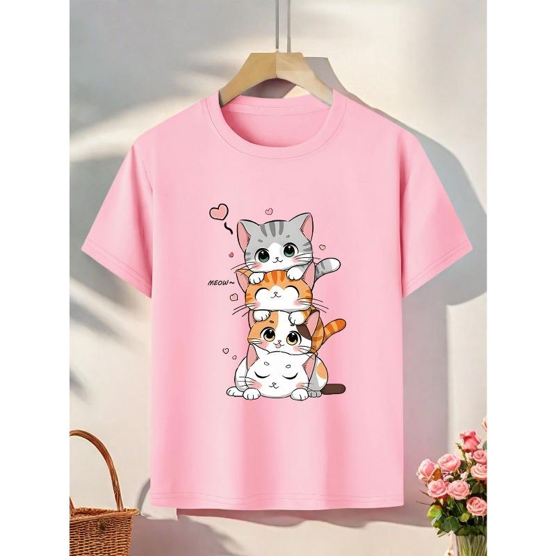 European sizes Cute Cartoon Cat Pattern T-Shirt - Soft And Comfortable, Featuring Three Cartoon Cats, Perfect for Summer Casual Wear,