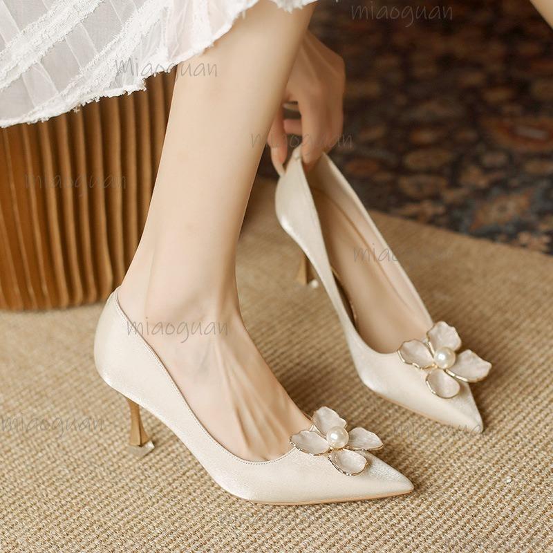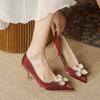 Satin White Pointed Toe Elegant Ladies High Heels Pearl Flower Decors Bridal Shoes Luxury Fashion Heeled Pumps Tacones Mujer