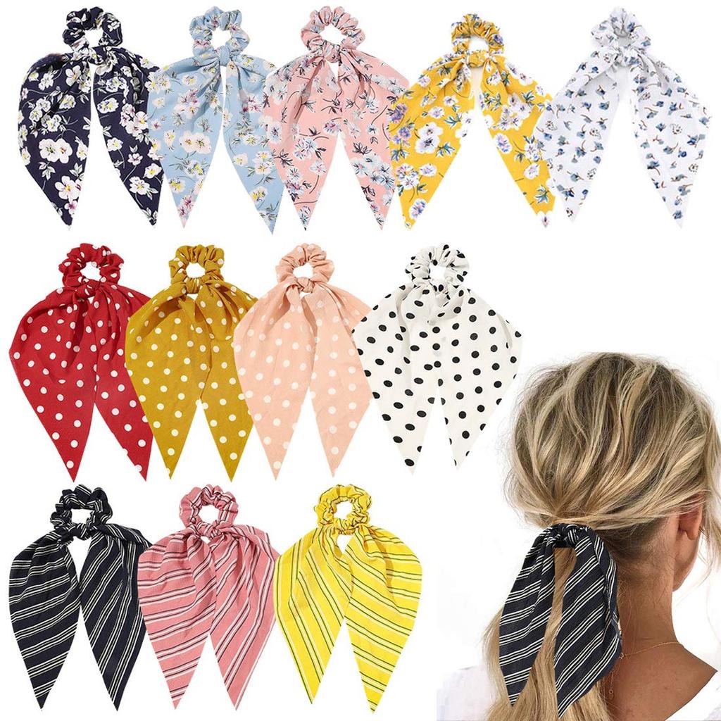 Print Scarf Pony. 12 striped, dotted and floral scarf scrunchies are enough for daily wear or sharing with friends and family. Make your daily outfit more elegant and charming.