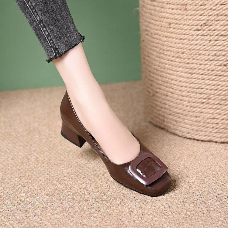 Retro French medium heel small leather shoes new autumn soft leather shallow mouth single shoes square head shoes