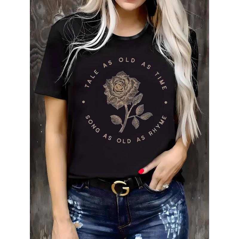 Ανδρικό/Γυναικείο Casual T-Shirt Ευρωπαϊκού Μεγέθους - "Tale as Old as Time" Με Γραφικό Τριαντάφυλλο Κοντομάνικο Μπλουζάκι, Με Στρογγυλή Λαιμόκοψη Κανονικής Εφαρμογής Μπλούζα, Casual Ένδυση για Όλες τις Εποχές