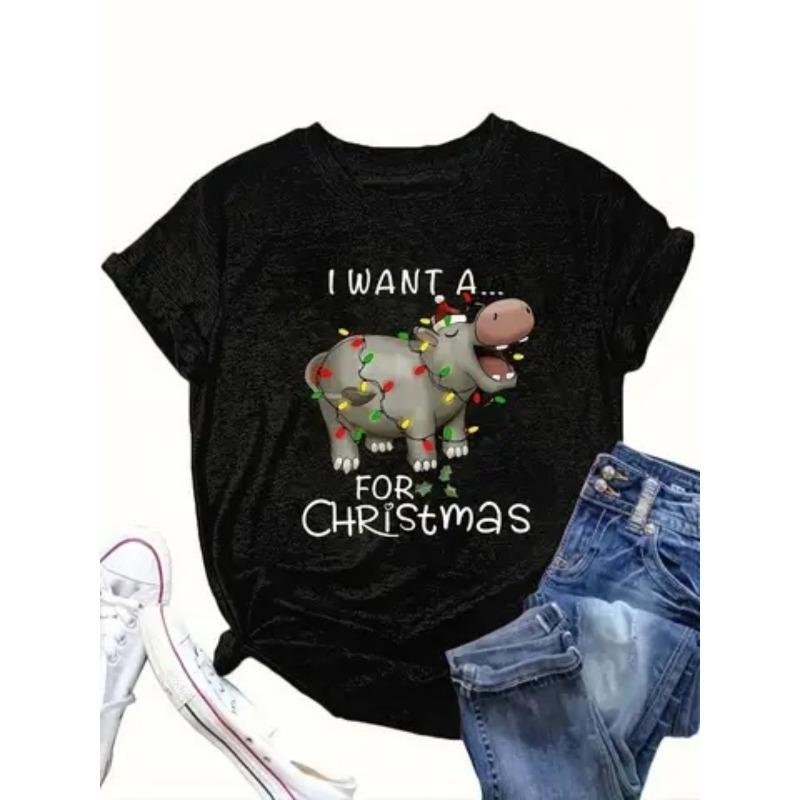 180g Large Size Women'S T-shirt Hippopotamus As A Christmas Gift" Casual Crew Neck Short Sleeved Top, Suitable for Holiday