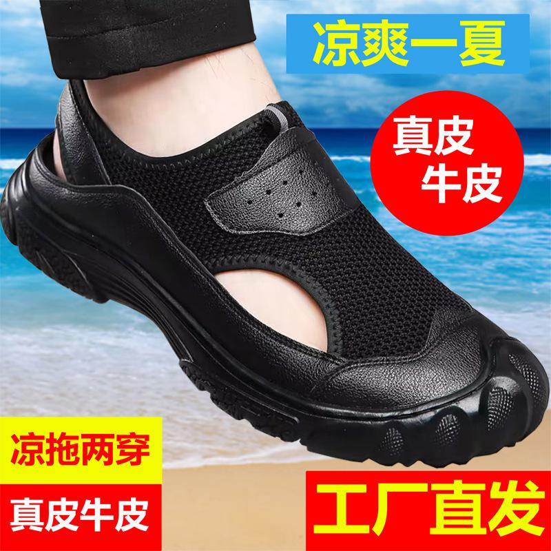 Summer new cowhide mesh hollow shoes one shoe two wear cowhide sandals one pedal men's driving shoes